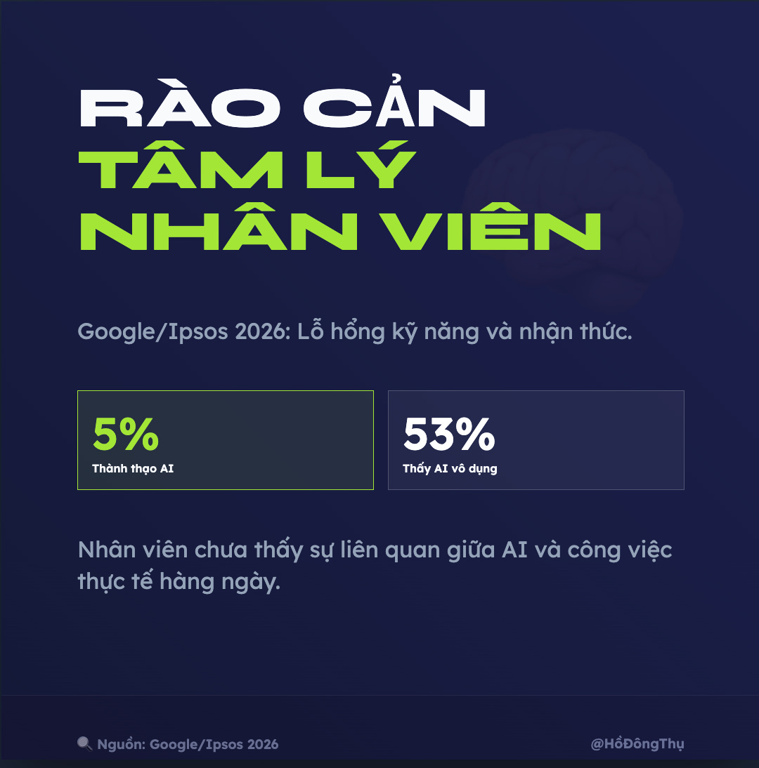 Nghiên cứu từ Google/Ipsos 2026 cho thấy chỉ có 5% nhân viên thực sự thành thạo (AI fluent) Có tới 53% nhân sự cảm thấy AI không áp dụng được vào công việc hàng ngày của họ, tạo ra một lỗ hổng lớn về nhận thức.