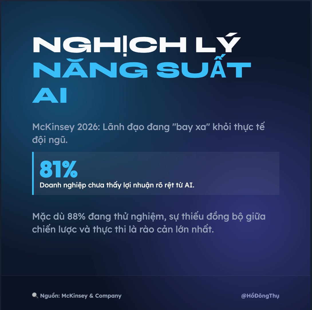 Theo báo cáo của McKinsey 2026 “AI to ROI Reports & Data: The State of Organizations 2026 by McKinsey & Company”, 88% tổ chức đang thử nghiệm AI, nhưng có đến 81% không thấy tác động rõ rệt đến lợi nhuận. Nguyên nhân chính là sự lệch pha giữa chiến lược của lãnh đạo và khả năng thực thi thực tế của nhân sự.