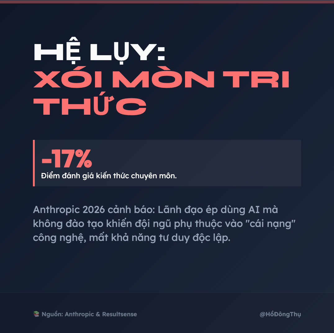 Theo nghiên cứu từ Anthropic, việc áp đặt công cụ AI mà không có lộ trình đào tạo bài bản có thể làm giảm 17% điểm số đánh giá kiến thức của nhân viên. Nhân sự dễ rơi vào trạng thái lệ thuộc (AI as a crutch) và mất dần tư duy độc lập.