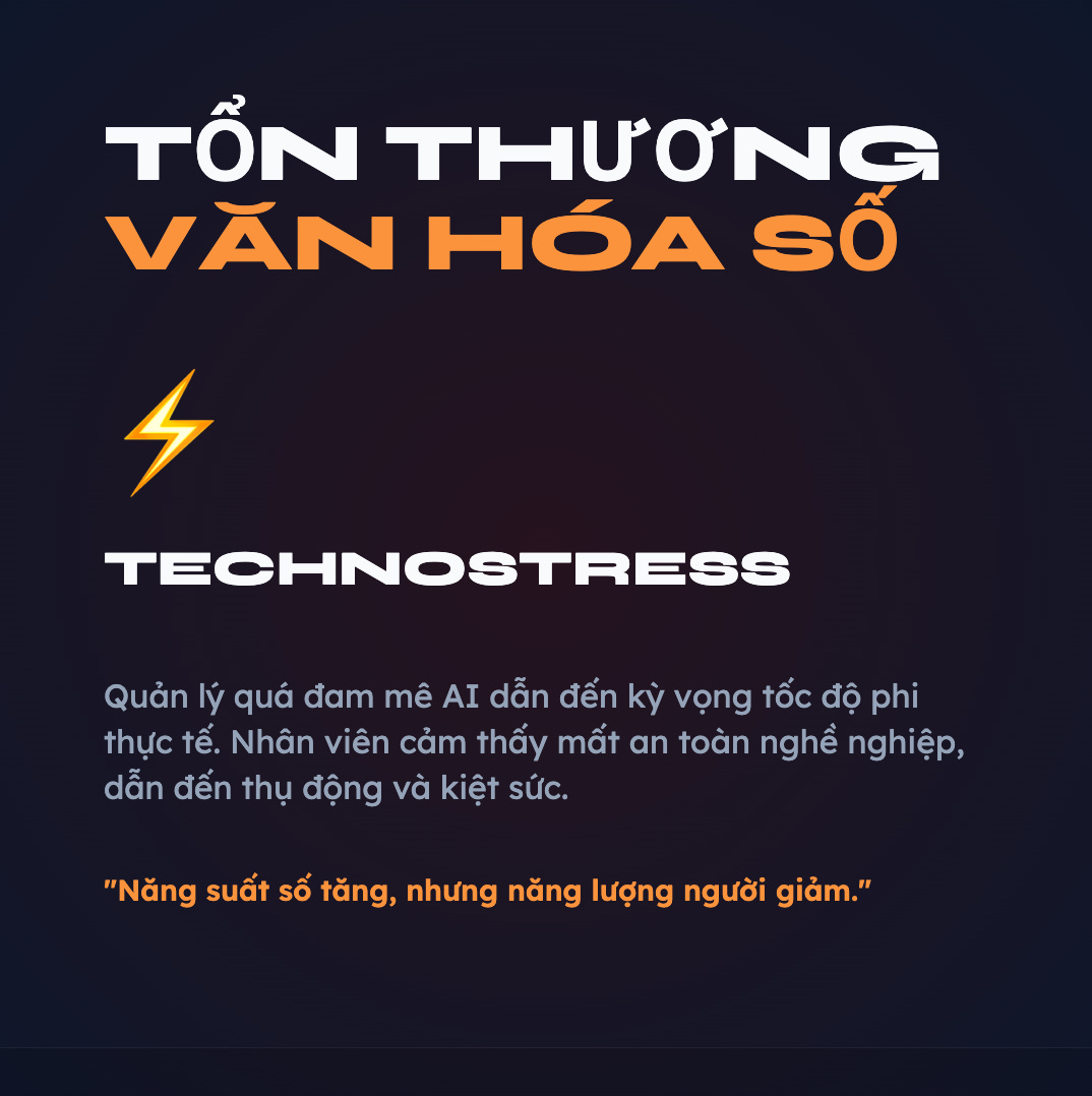 Khi kỳ vọng của sếp về tốc độ tăng quá nhanh nhờ AI, nhân viên cảm thấy bị áp lực, mất an toàn nghề nghiệp và trở nên thụ động. Năng suất ảo trên số liệu có thể tăng, nhưng “năng lượng con người” đang cạn kiệt dần (Theo Training Journal).